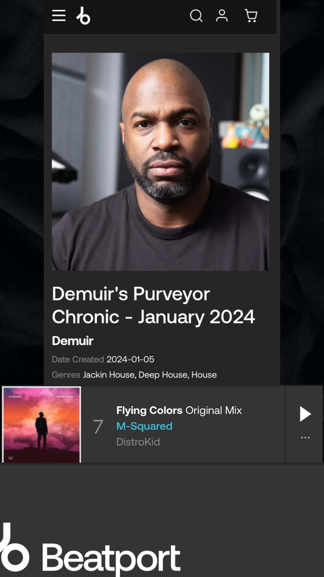 Big Thanks to Demuir for Charting my new track ‘Flying Colors’ on his Beatport Purveyor Chronic Chart Top 10 Selections for January 2024! Much respect! Get the full chart here: https://www.beatport.com/chart/demuirs-purveyor-chronic-january-2024/800667